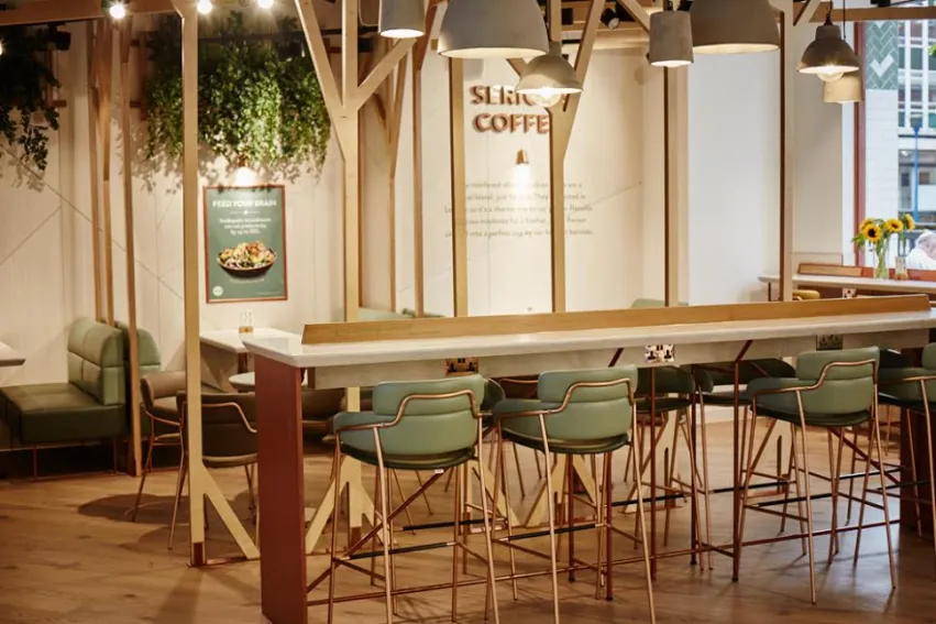 Modern in store technology such as slick digital screens and subtle lighting systems that change to reflect the mood of the restaurant put the customer experience first. The leather seats, marble top tables, granite surfaces, scandic trees and cladding are created from top quality materials with various shades of green to create a relaxing atmosphere.
