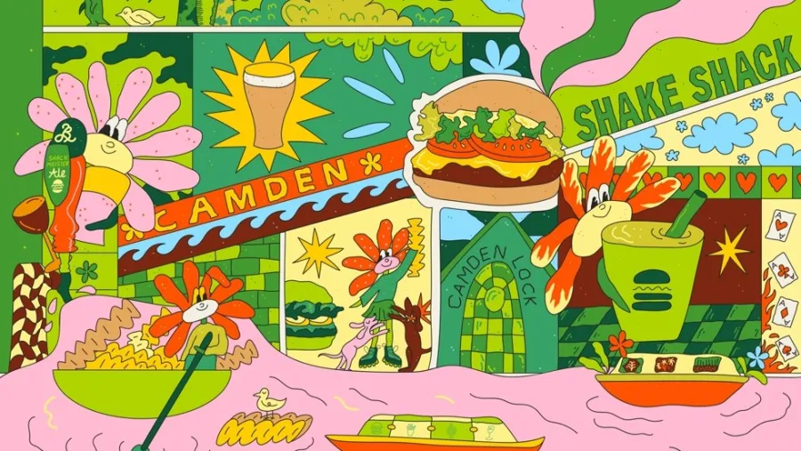 In anticipation of the opening, Shake Shack is collaborating with London-based artist Aga Giecko on a custom illustration for the building’s exterior. Inspired by the energy and culture of Camden, Aga blends Shake Shack’s menu items with her take on the iconic sights of Camden.