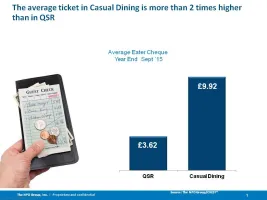 The NPD Group has revealed how Casual Dining contributes to an increasing proportion of Foodservice traffic - accounting now for 4% of all visits. Although still quite small, their traffic has grown by 29% since 2009. Casual Dining now equates to 441 million visits in the year ending September 2015. Fiscally, Casual Dining generates 4.4 billion pounds to the Foodservice Industry. This channel has a much higher average ticket (£9.92) than QSR (£3.63).