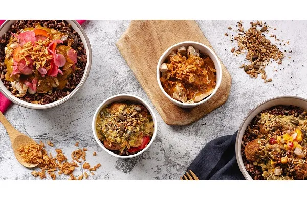 The Katsu Curry and Spinach & Coconut Dhal both comes with a choice of protein, grilled mushrooms, pickled vegetables, onions, katsu curry sauce & supergrains.