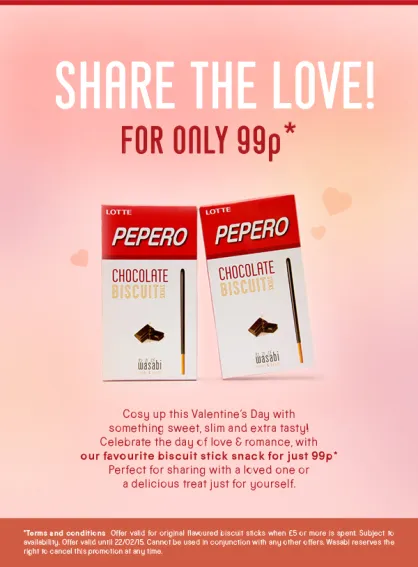 Wasabi, the Japanese chain are offering Lotte Pepero Chocolate Biscuits for 99p for the next fortnight.