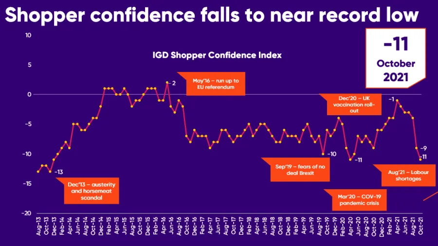 “It comes as no surprise that shopper confidence has decreased once again, following the steady decline we’ve seen in recent months. It paints a bleak picture for the winter and shoppers will remain highly sensitive to price rises and news relating to availability. With labour supply stretched thin and declining confidence, the Christmas trading period is likely to be a challenging time,” said Simon Wainwright, director of global insight at IGD.